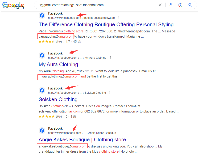 例如搜索facebook网页包含clothing的邮箱,搜索指令是 "@gmail.com" "clothing" site: facebook.com